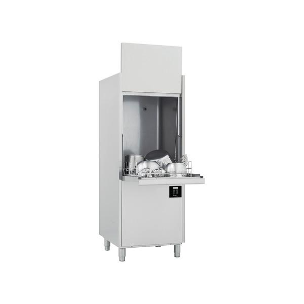 Модель оснащена электронной панелью управления и цельнотянутым баком. Конструкция дверцы с разделением на 2 части позволяет использовать ее как столешницу при загрузке / выгрузке посуды. Корпус и разбрызгиватели выполнены из нержавеющей стали.