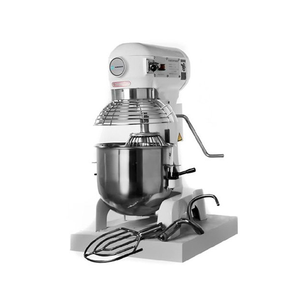Съемная дежа выполнена из нержавеющей стали. В комплект поставки входят крюк, венчик и лопатка.
