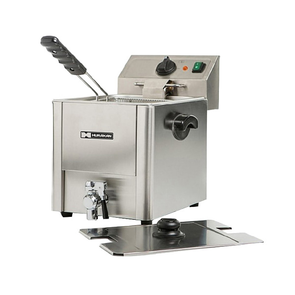 Модель оснащена электромеханической системой управления, регулировкой температуры, холодной зоной и краном для слива масла. Корпус выполнен из нержавеющей стали.